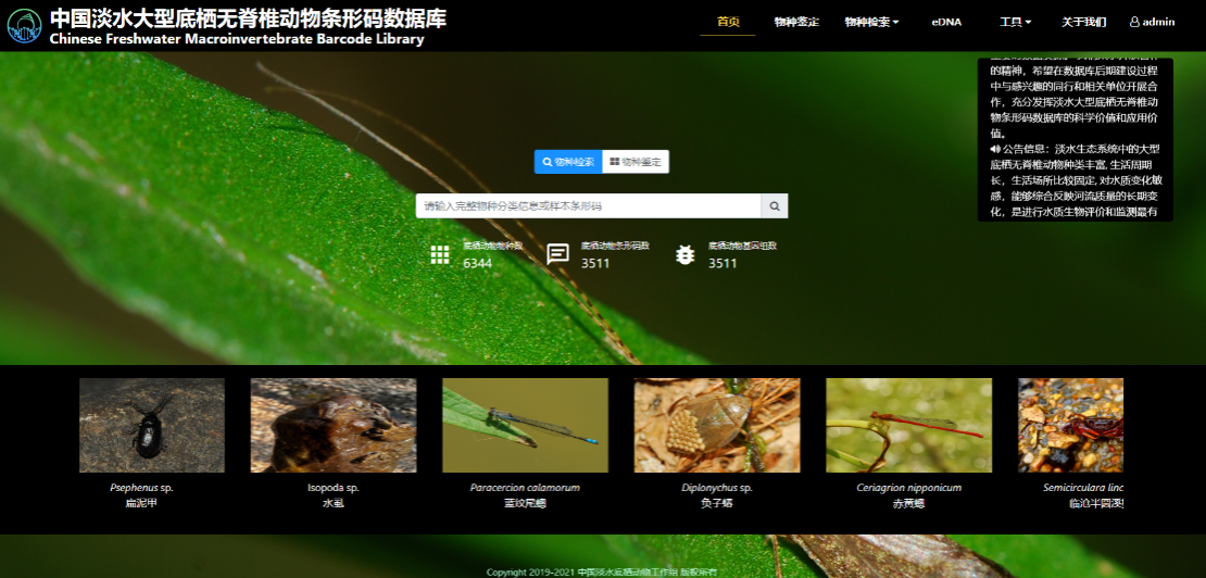 2021年南京农业大学携手国内15个高校和科研院所研发的中国淡水大型底栖无脊椎动物条形码数据库,经过多年的数据积累、数据库功能开发和网络开放使用功能研发与优化后正式对外开放//cfmlib.zxzwav.com/(数据库注册使用等事宜,请联系[email protected])。