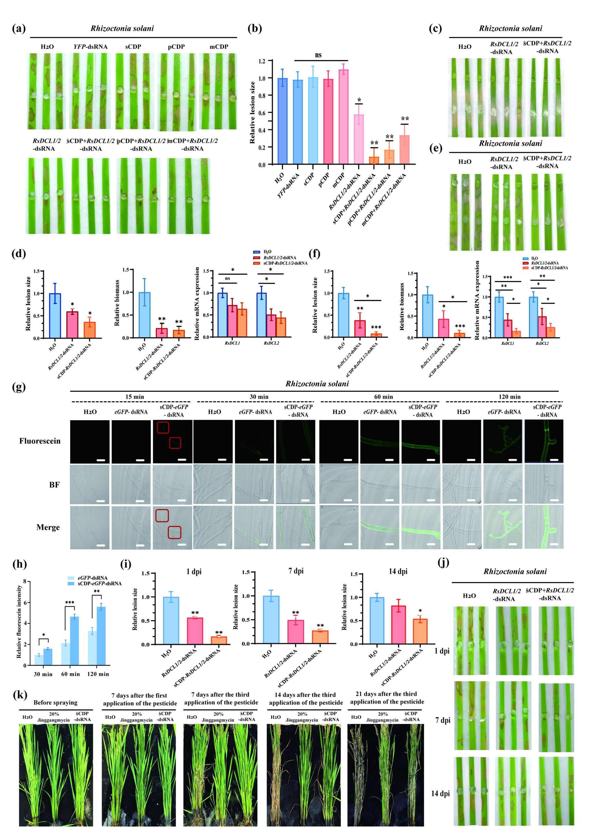 该研究以菌渣、蕨菜、菌渣:蕨菜(1:1)为原料成功合成了sCDP、mCDP和pCDP三种碳量子点(CDPs),透射电镜显示三者均为直径小于10 nm的球形颗粒,XPS分析表明其主要由C、N、O元素构成。经PEI修饰后,CDPs表面带正电,可通过静电作用吸附带负电的核酸。DLS测定显示sCDP流体力学直径最小(3.06 nm)。结果显示,不同CDPs特别是sCDP能够帮助dsRNA进入病原菌细胞或植物细胞内部,显著提高dsRNA的吸收效率。此外,sCDP-dsRNA 在叶面吸收与真菌内转运的荧光信号显著增强,且随时间增加。进一步的双重处理结果表明,sCDP-RsDCL1/2-dsRNA 与水对照相比几乎实现 100% 病斑抑制(图3a,c,e),且明显优于直接接触、间接接触处理组合。保护持续性方面,sCDP-RsDCL1/2-dsRNA 处理后1、7、14 d的病斑抑制率较显著,14天时仍保留约 46% 的防控效果,显著高于单独dsRNA(图3j)。田间试验中,该纳米复合物在易感水稻品种上实现约 64.6% 的病害控制率,且在 21 天后仍维持较高抑菌率(图3k),显示良好的环境友好性与潜在产业化前景。综上所述,碳量子纳米材料sCDP 显著提升 dsRNA 的叶面吸收、远端传输与病原菌内 RNAi 激活,并且展现对多病原真菌的广谱防控潜力,为病害绿色防控提供一种可持续、高效的作物病害防控策略,具环境友好性与潜在产业化前景。