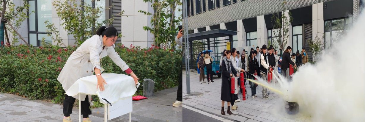 最后,全体参训师生来到21栋实验楼北门,进行灭火器实操培训。在现场指导员的专业讲解和示范下,参训师生轮流上阵,亲身体验如何使用干粉灭火器扑灭明火。通过“真枪实弹”的演练,参训师生熟练掌握了灭火器的操作要领,实现了从“理论知识”到“实战技能”的跨越。