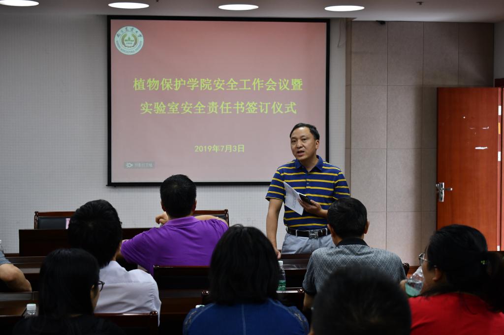分管学院安全的副院长王兴亮从不同角度汇报了安全工作背景,列举并简要分析了最近几年发生较为严重的安全事故及发生原因;同时汇报了这学期学校和学院的安全检查工作,排查并整改了诸多安全隐患。最后宣读了学校下发的文件—关于印发《南京农业大学实验室安全责任追究办法(试行)》的通知,让各个实验室的负责人和安全员老师进一步意识到自己的责任重于泰山、安全高于一切。