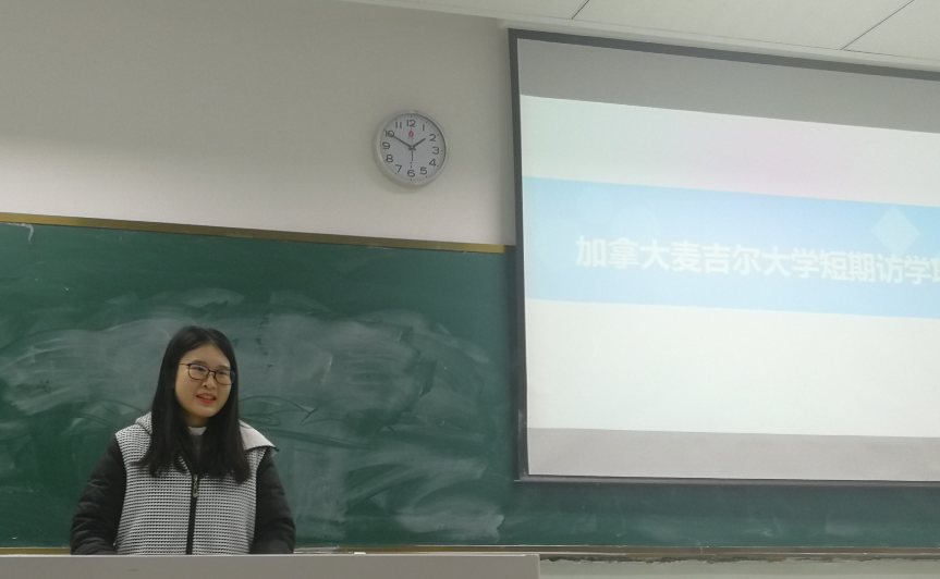 最后胡玥同学就自己在今年10月底参加的加拿大访学经历,向大家详细介绍了加拿大短期访学项目。她从前期准备、学校概况、课程安排、风景名胜和访学收获四个方面出发,讲述了自己的经历。胡玥认为,加拿大放学项目带给她的不仅仅是学到了知识、开拓了眼界、欣赏了风景,更重要的是培养了自己独立自主和沉着对事的能力。