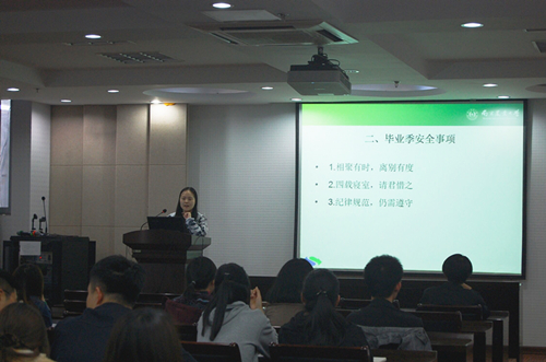 李艳丹老师在会上首先强调了诚信还贷的问题,李老师提醒同学们一定要在毕业后按时还贷,积累良好的社会信用,体现南农学子的良好风采。之后李老师介绍了一些临近毕业应该注意的安全事项,提醒同学们注意饮食与出行安全,同时告知了毕业证与学位证的获得条件,就业推荐表和就业协议书的相关事项。接着,李老师又着重讲了毕业后档案与户口的问题,还指导同学们使用“智慧就业系统”。在会议结束后李老师根据同学们的疑惑进行了解答,同学们表示在此次大会上受益匪浅。
