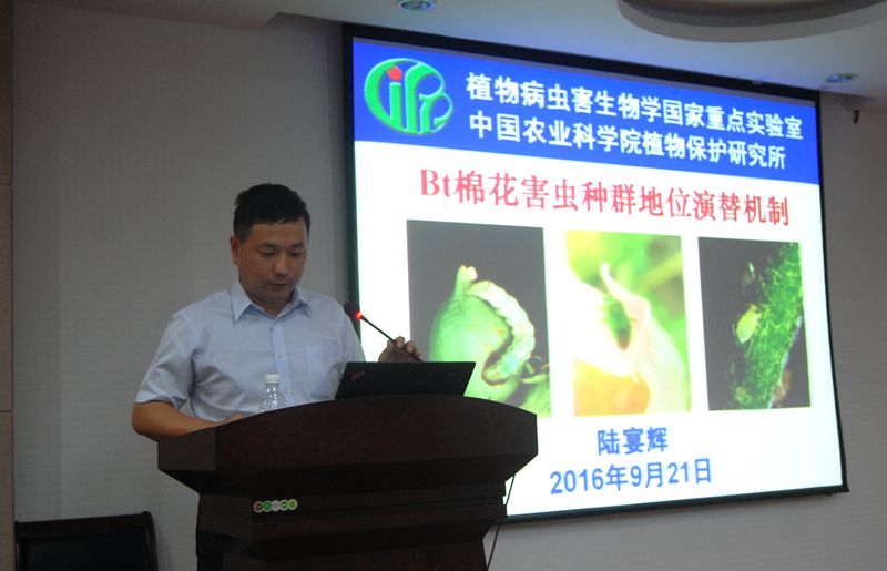 植保所研究员陆宴辉作“Bt棉花害虫种群地位演替机制”主题报告,从研究棉花害虫棉铃虫的发生与防治,到研发出切断棉铃虫季节性转换链的Bt棉花,陆宴辉说他们耗费了三十几年青春和心血,“科研路漫长曲折,需要你我秉持耐心与激情一直走下去,直到觅得果实”。