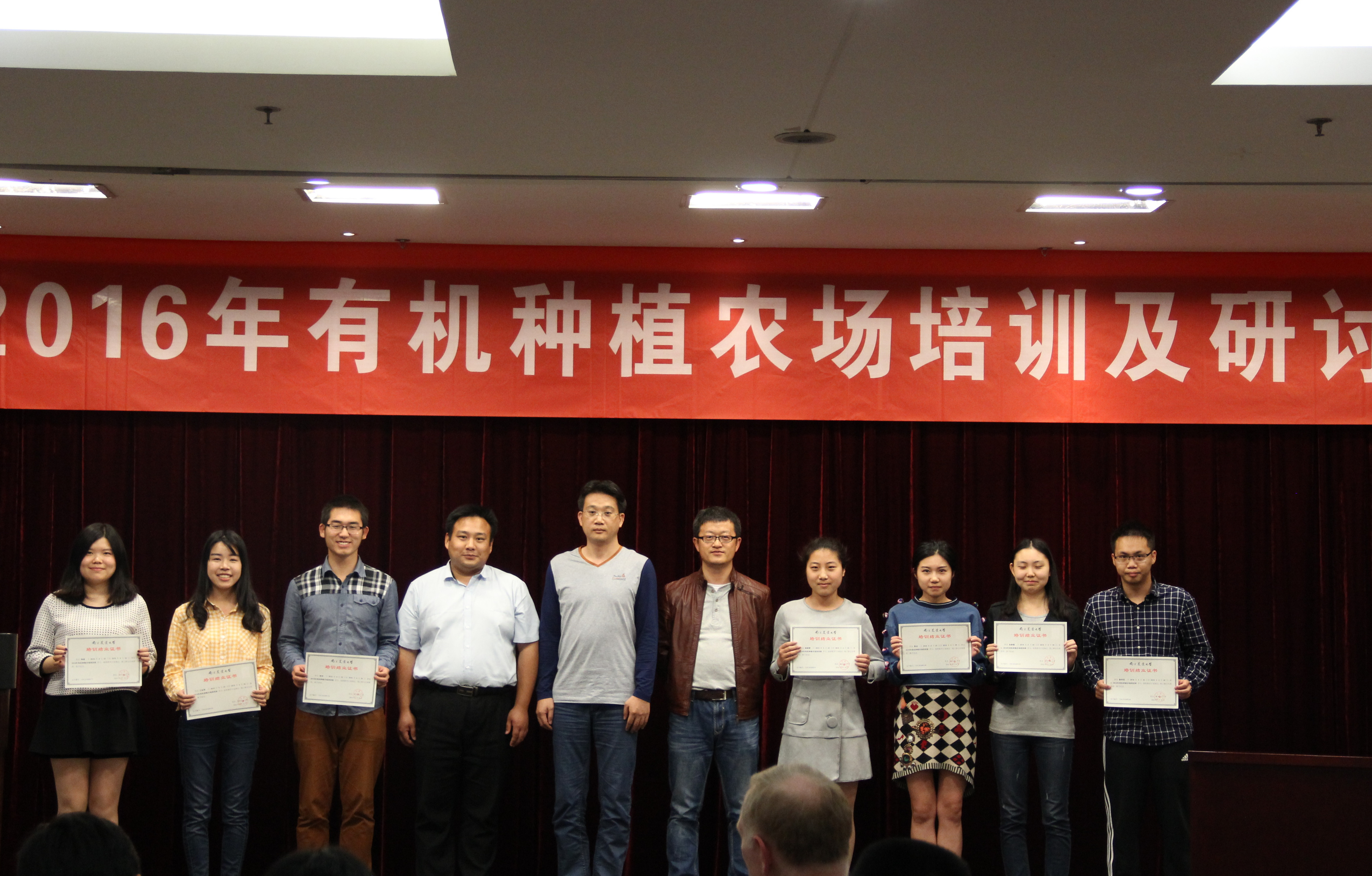 副院长叶永浩教授为参会人员代表颁发培训结业证书。北京奥科美技术服务有限公司刘鹏先生,广西河池市丹阳红心猕猴桃产业发展有限公司莫根远先生、无锡本元生物科技有限公司陈刘军先生代表赞助企业为接受“青年新农人会议基金”资助的有志于有机事业的优秀农科大学生、硕士生和博士生颁发培训结业证书。
