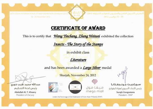 第28届亚洲国际邮展于2012年11月20~26日在阿联酋的沙迦举办。我校植保学院退休教授王荫长和集邮名家张巍巍合作编写的《邮票图说:昆虫世界》一书在此邮展上获得文献类大银奖。