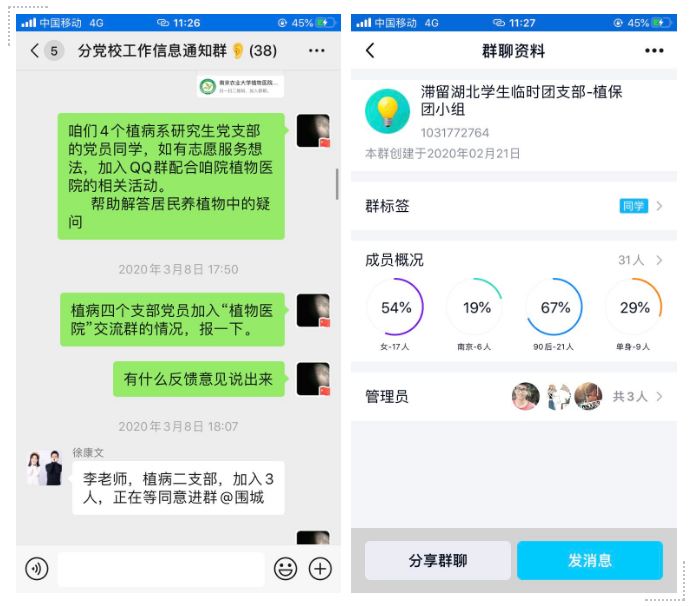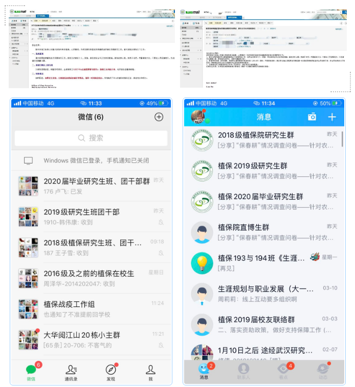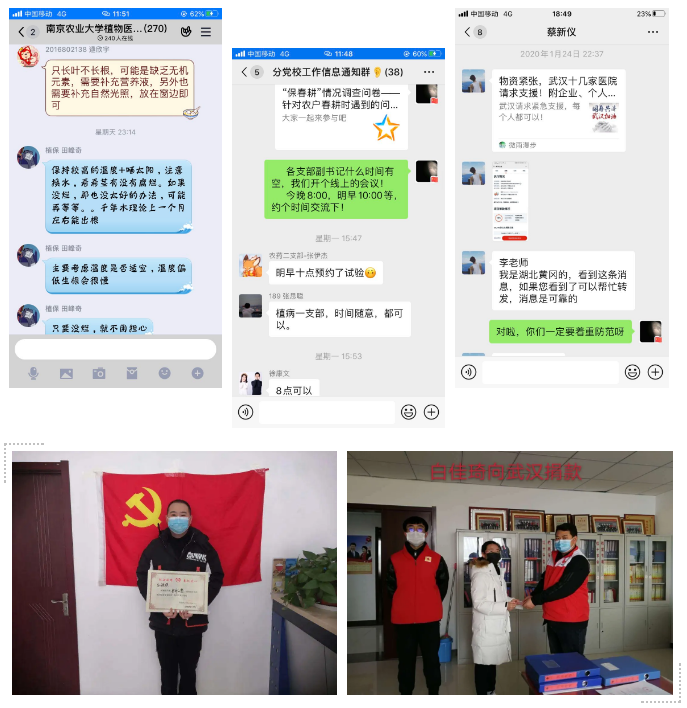云端战“疫”:党支部研究生,投身“大学生植物医院”,为居民和农户开展线上问诊;号召广大研究生,“保春耕”情况调查问卷;湖北籍研究生蔡新仪,在疫情初期,积极号召学院师生为武汉捐资捐款。
