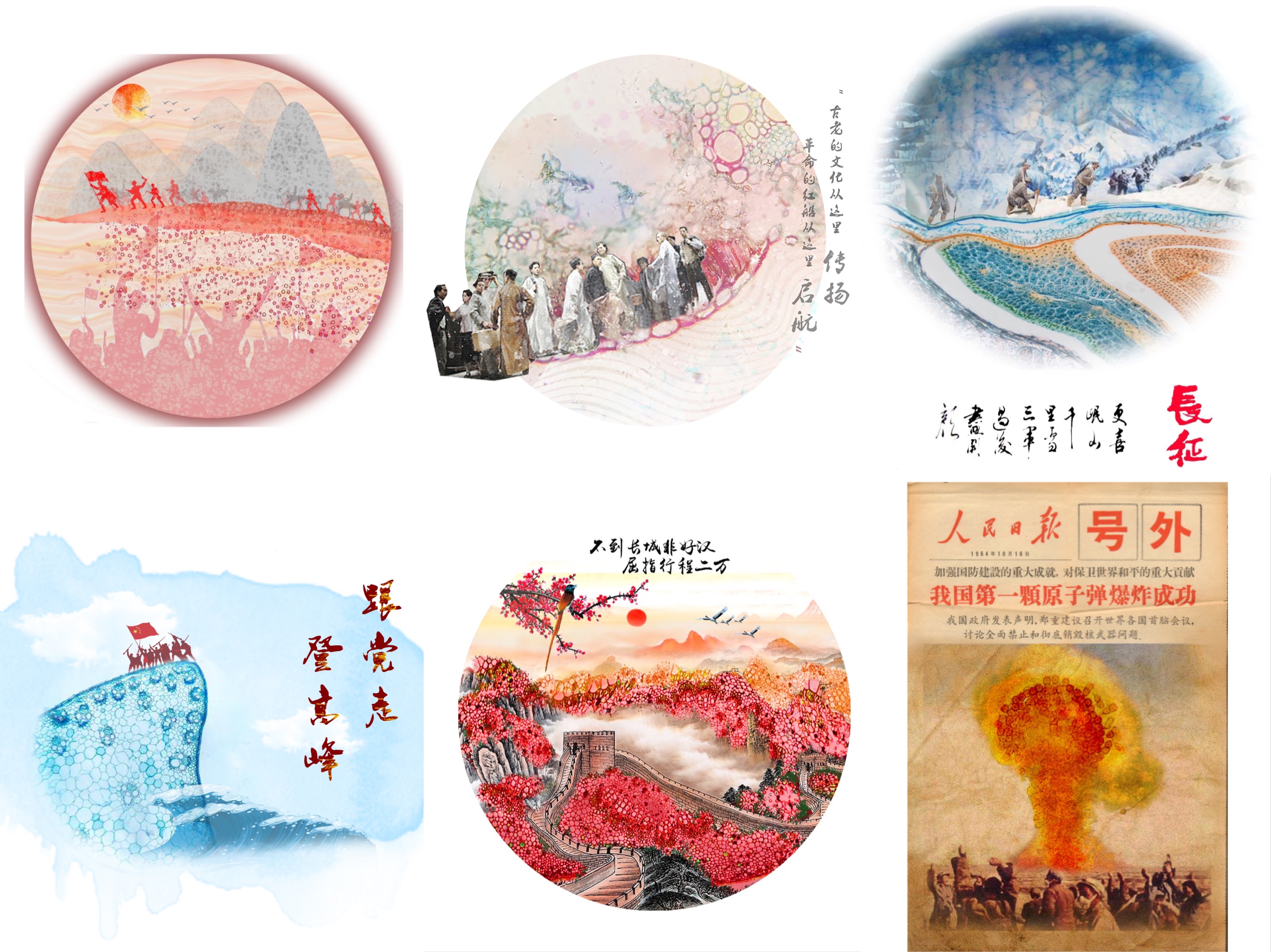 嘉兴湖上红船轻摇、革命根据地星火燎原、长征路上蜿蜒迤逦的行军行列、天安门前升起的第一面国旗、第一颗原子弹成功爆炸、改革开放后中国巨变……一幅幅波澜壮阔的党史画卷徐徐铺展,竟是学生用显微镜下的病原菌图创作的!