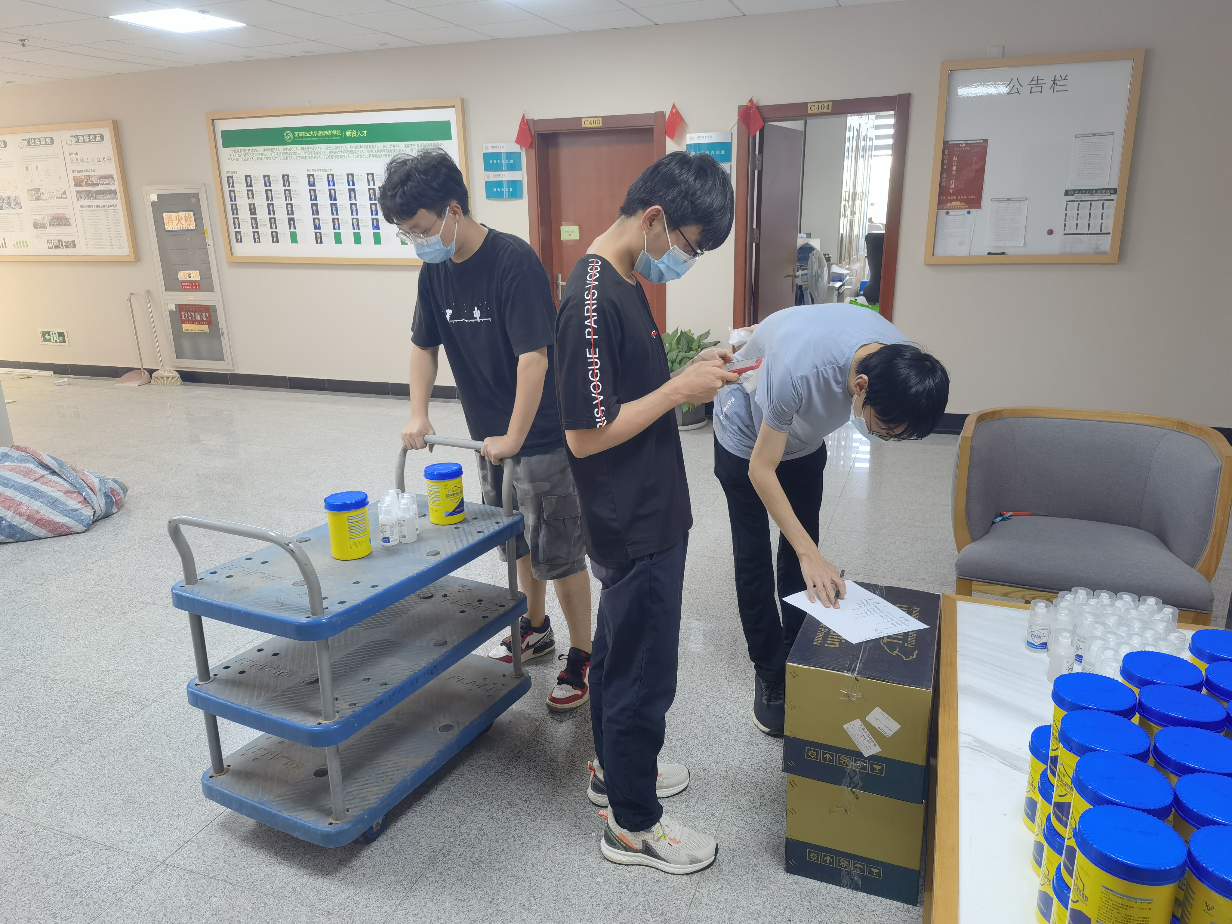 自南京突发新冠肺炎疫情以来,学院始终将守护师生生命健康安全放在首位,在第一时间对疫情防控工作做出响应。在接收捐助物资后,学院迅速制定派发计划,及时通知各实验室前来签领消毒粉和消毒液,确保企业的爱心捐助落实到位,进一步加强校园卫生安全和师生身心健康。