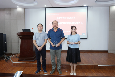 学院党委书记邵刚和院长张正光为到场的光荣在岗10周年的王欣、吴智丹、张海峰、侯毅平、郑颖、马洪雨等老师,在岗20周年的姜卫华、李保平两位老师以及在岗30周年的洪晓月、孙长海、郎志飞三位老师颁发了纪念奖杯。洪晓月、李保平、马洪雨分别作为代表分享感悟。