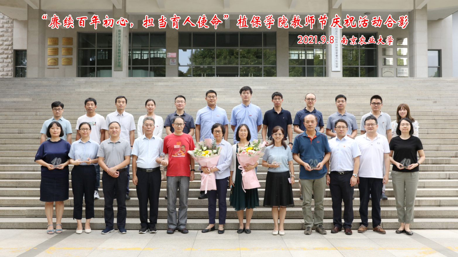 活动结束后,全体新入职教师,光荣在岗10周年、20周年、30周年教师,荣休教师在理科楼楼下合影。