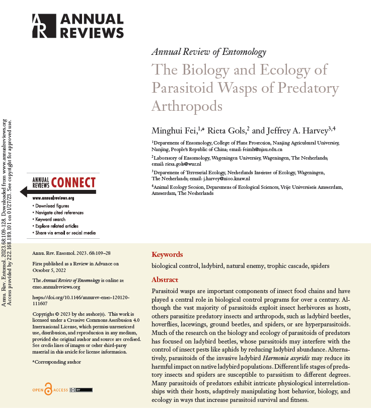 害虫生物防治实验室费明慧副教授,在昆虫学领域国际顶尖学术期刊Annual Review of Entomology(昆虫学年评,影响因子22.682)在线发表了题为“The Biology and Ecology of Parasitoid Wasps of Predatory Arthropods(捕食性节肢动物的天敌寄生蜂的生物学及生态学研究)”的综述文章。