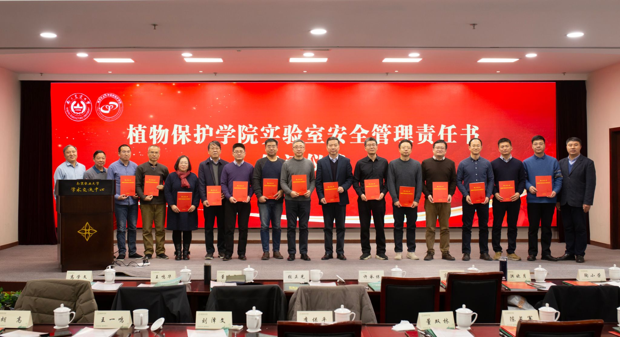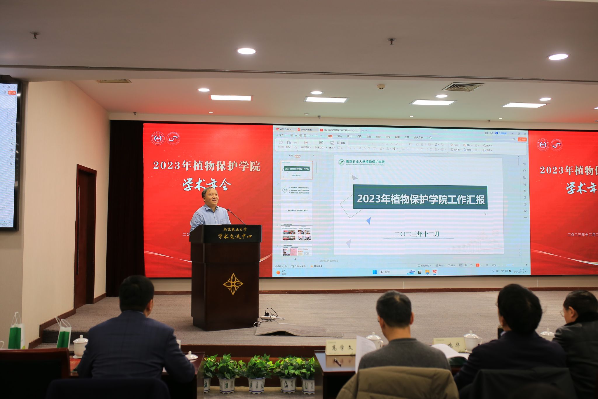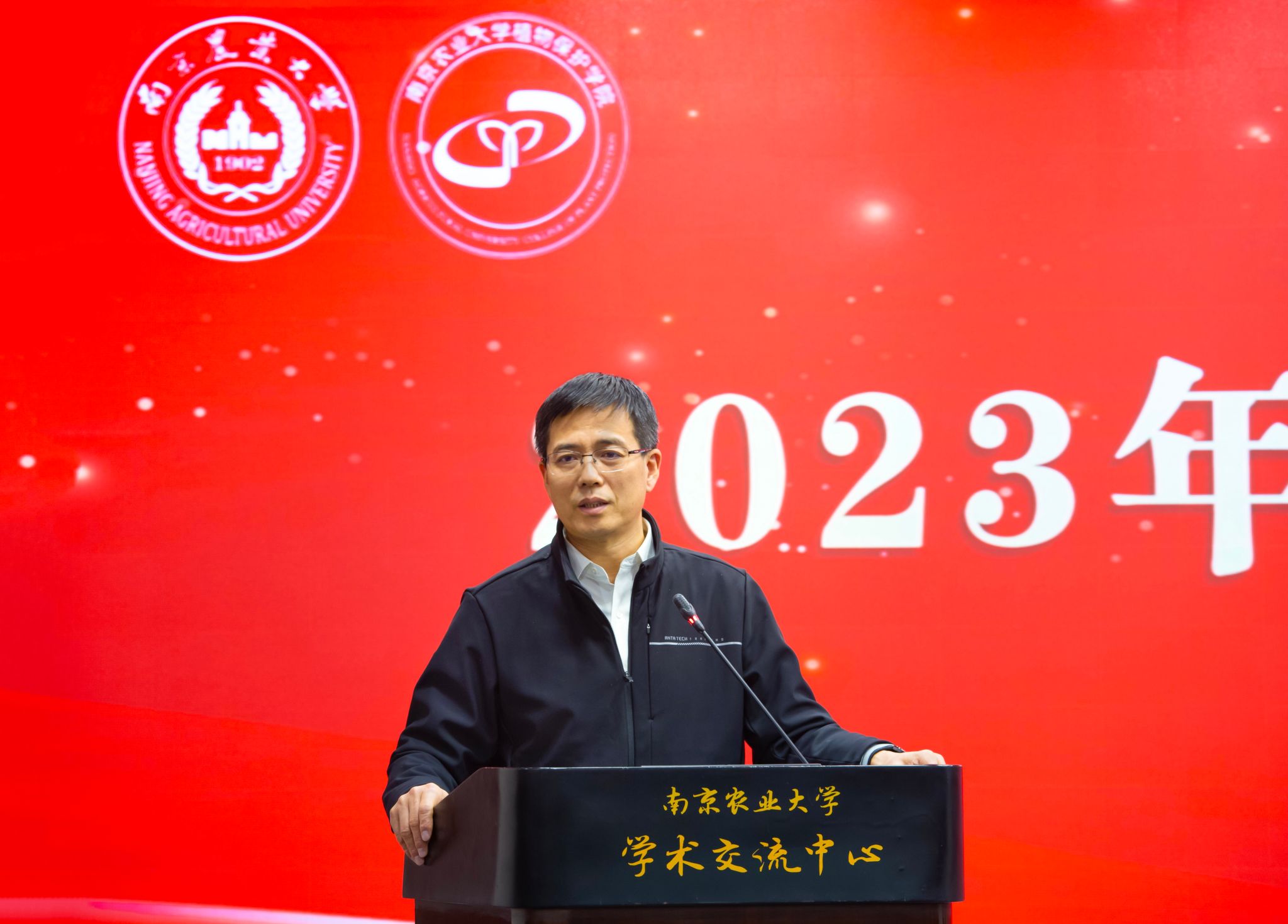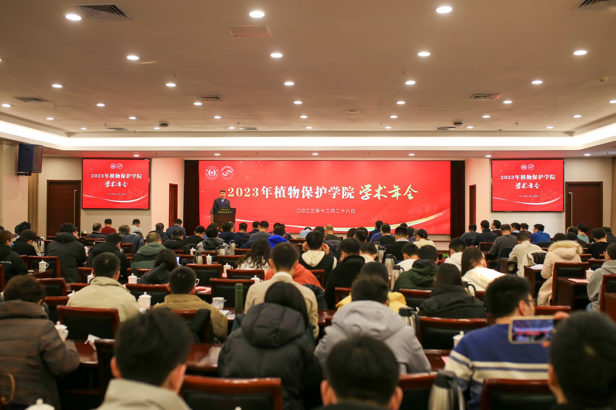 2023年度学术年会在我校学术交流中心六楼报告厅举行。校党委常委、副校长王源超,退休教师代表沈晋良教授、杨莲芳教授、吴耀清教授、翟保平教授,杭州欢田喜地农业科技有限公司总经理李涛,南京博兰德生物科技有限公司总经理李赟、市场部经理杨永刚,格来赛生命科技(上海)有限公司市场部经理赵晓明等受邀参加年会。校计财与国有资产处副处长(主持工作)郑岚应邀作专题报告。植保院领导班子成员、全体教职工以及部分研究生参加会议。