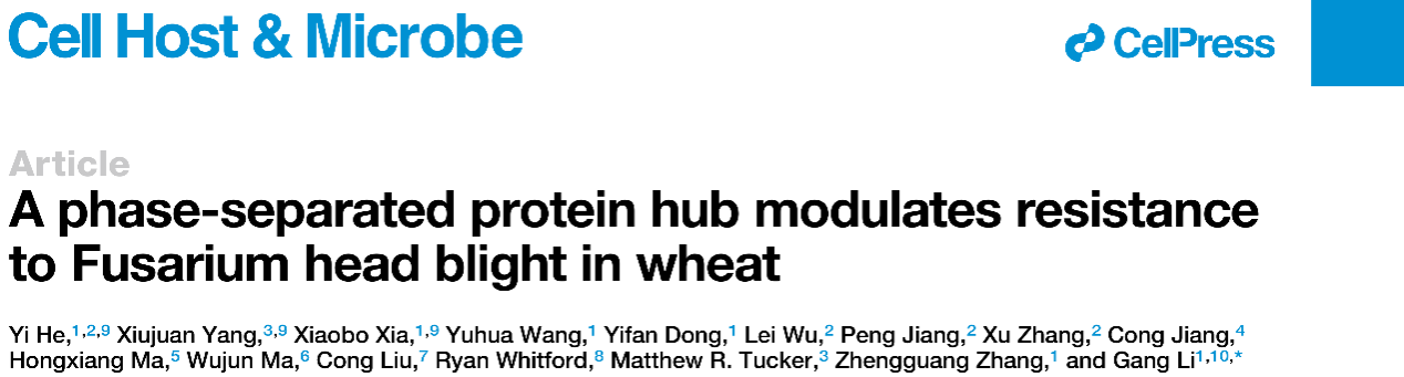 张正光教授领衔的“稻麦真菌病害与控制”团队李刚教授课题组联合江苏省农科院、澳大利亚阿德莱德大学等单位,在国际学术期刊Cell Host & Microbe在线发表了题为 “A phase-separated protein hub modulates resistance to Fusarium head blight in wheat” 的研究论文(封面文章)。该研究揭示了Fhb1位点关键基因编码蛋白TaHRC通过“液-液”相分离驱动大分子凝聚复合体调控小麦抗感赤霉病的作用机制。