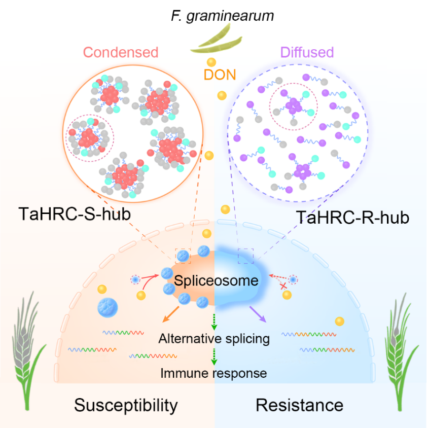 进一步研究发现,TaHRC-S和-R招募相同的可变剪切蛋白复合体,形成HRC-hub,该复合体包括剪切体组分蛋白U1和Ser/Arg-rich可变剪切因子TaSR45a等。TaHRC-S能驱动HRC-hub成员的相分离,形成高凝聚态的HRC-S-hub;而TaHRC-R则抑制hub成员的相分离,导致形成非凝聚态(弥散态)的TaHRC-R-hub;该结果阐明了TaHRC-S和-R通过相反的机制驱动其复合体成员的相分离,进而分别维持复合体的“凝聚态和非凝聚态”,从而发挥赤霉病“感与抗”的功能。
