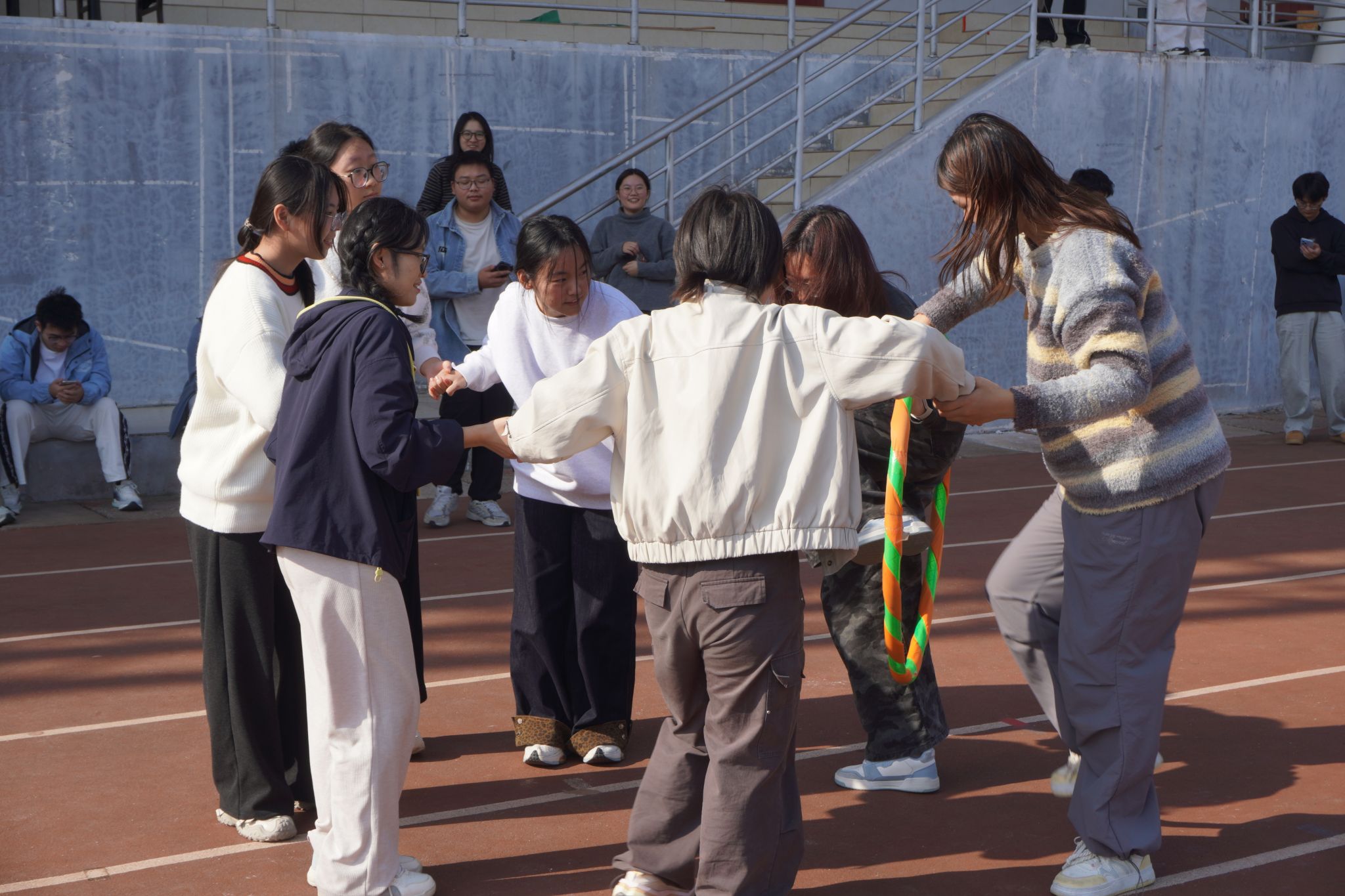 在呼啦圈传递中,传递数轮后动作已十分熟练,参赛者们流畅穿梭,呼啦圈依次越过。