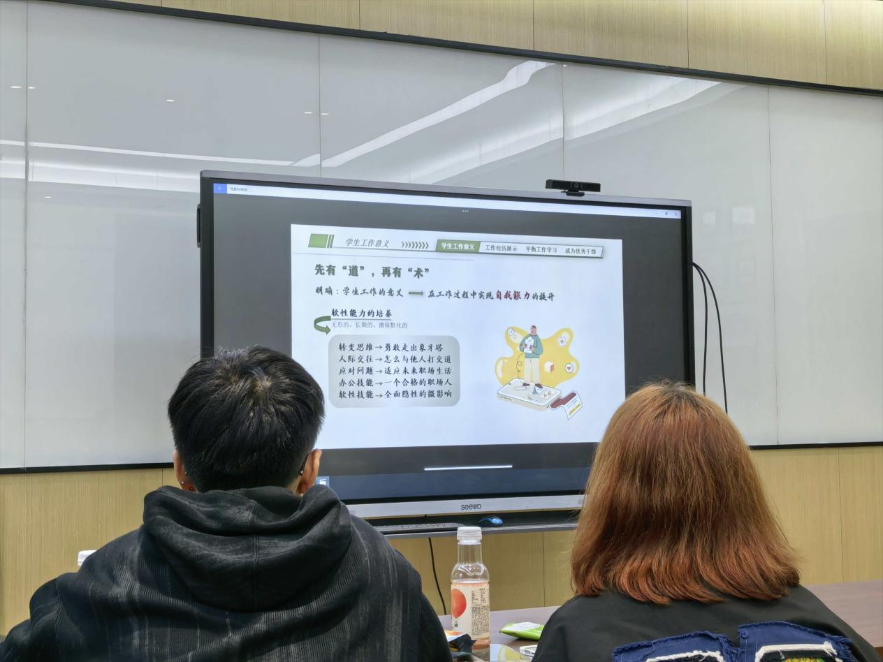 石一涵、胡皖豫学姐现场细心讲解学习心得,备考方法,从复习节奏到应试得分,每一句都是亲测有效的 “避坑指南”;此外,两位学姐还分享了关于心态调节,日常生活规划的小技巧,让低年级的班委们对大学生活有了更深刻的体会。