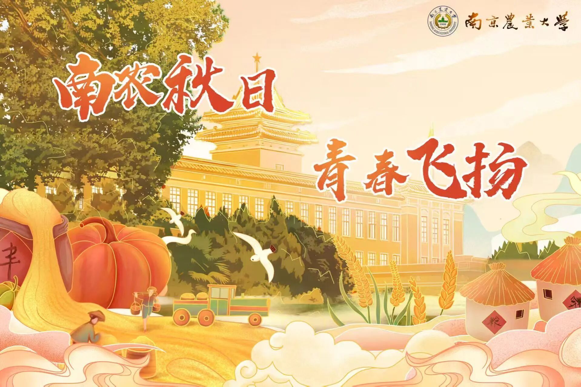秋日主题以暖色调为主,选用落叶的橙色,融入南京农业大学的主楼特色,并在左上方标上南京农业大学中文av