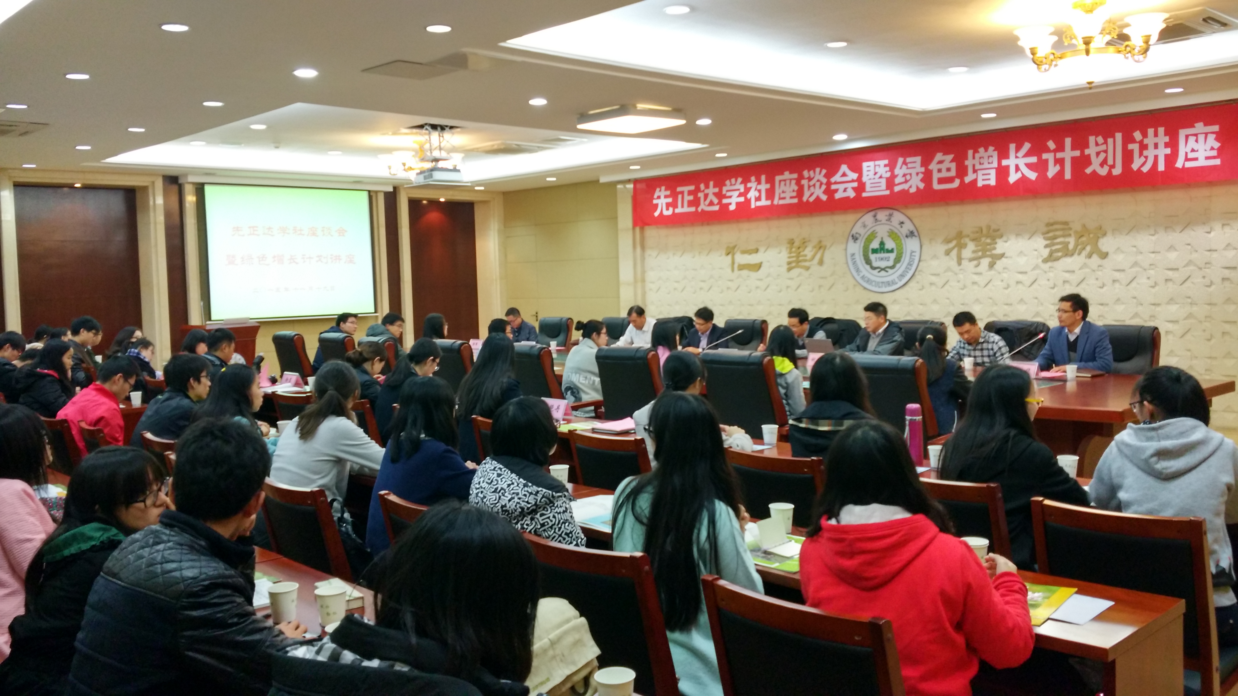 11月19日晚7点,先正达学社座谈会暨绿色增长计划讲座在南京农业大学金陵研究院三楼会议室举行。先正达企业事务总监朱庆华、政府事务总监张孟玉、农业可持续发展部总监孙津安、浙江大学祝增荣教授、中国农科院蜜蜂所郭军博士、先正达江苏区域经理李启荣、浙江区域经理吴国强出席,南京农业大学先正达学社成员、先正达暑期社会实践学生骨干参加。座谈会由植保院党委副书记黄绍华主持。