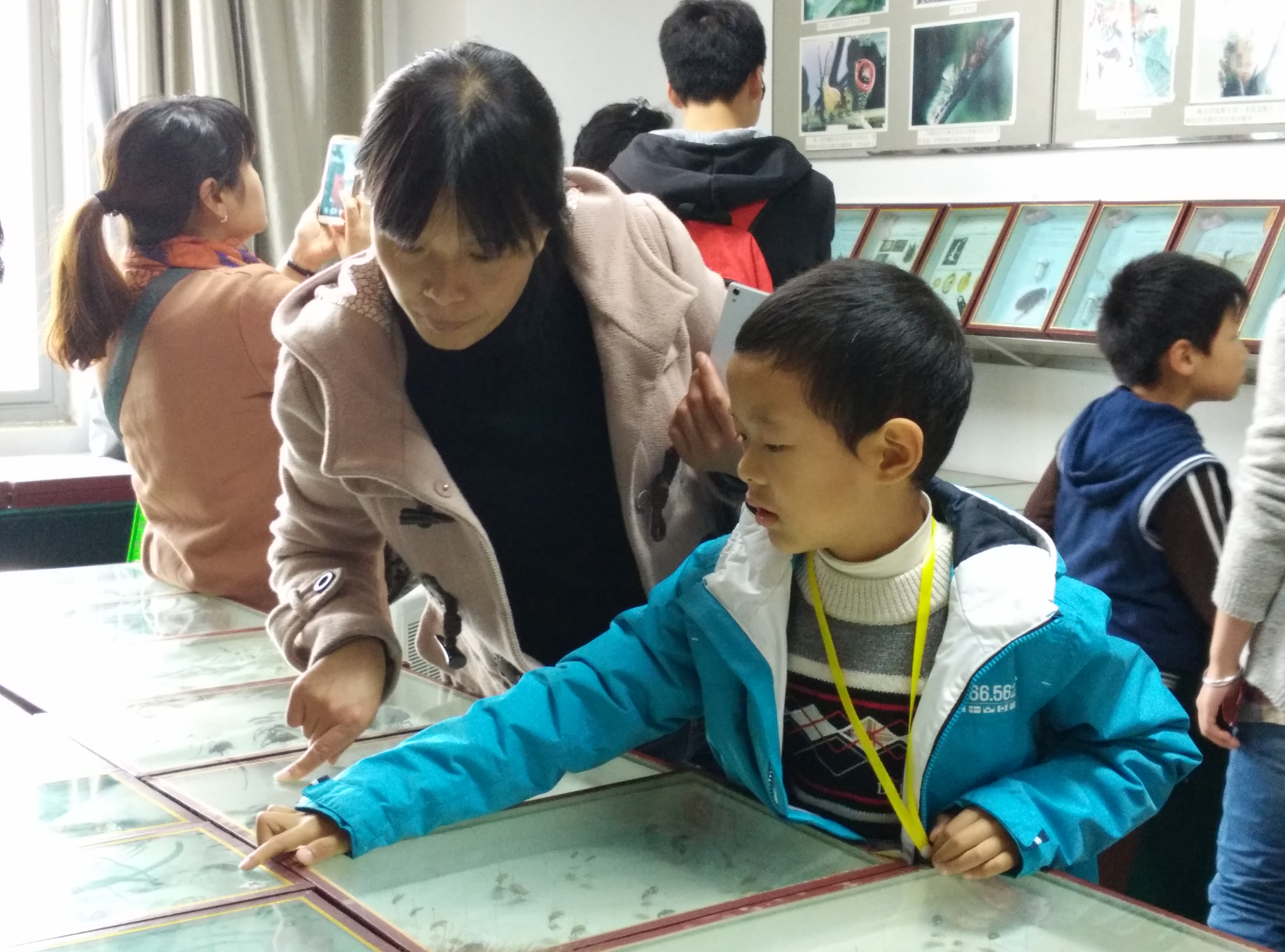 昆虫标本室,他们对呈现在他们眼前的各种昆虫充满了好奇,不断向志愿者们询问相关的昆虫知识,志愿者热情地对所有标本一一进行介绍。精彩的解说词,使参观者充分了解了植保学院的专业特色;敬业的志愿精神,让参观者感受到了南农植保学子的风采。相机快门的声音、志愿者们讲解的声音以及小朋友们和家长的欢笑声响遍了整个昆虫标本室。