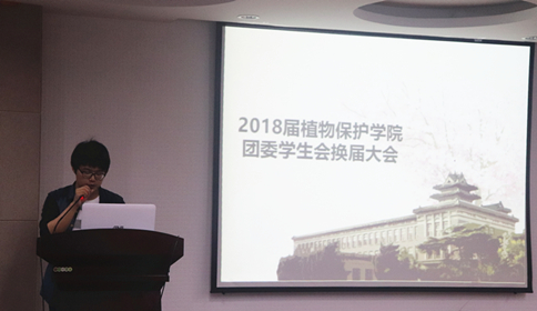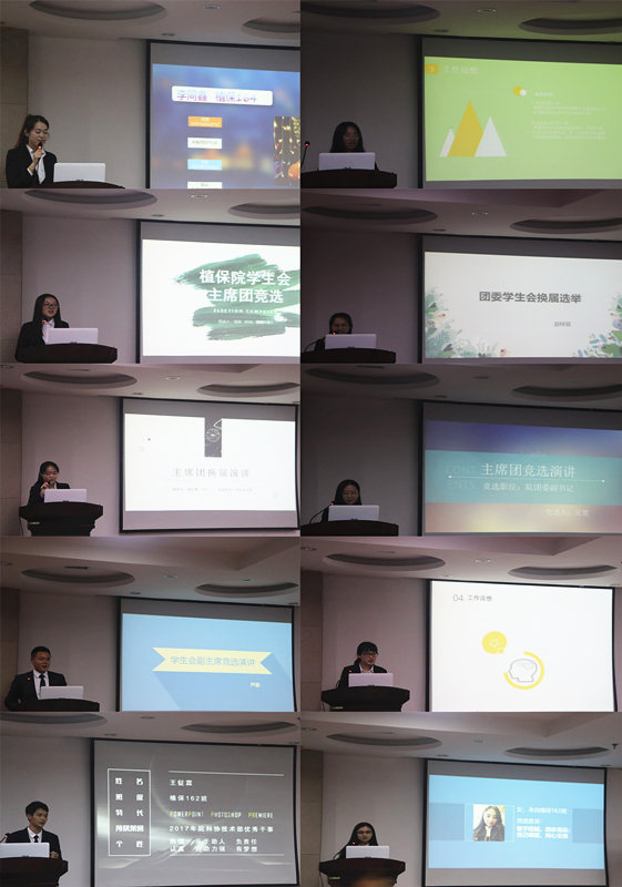 5月12日下午17:30,植保院第十九届团委学生会主席团换届竞选大会于理科楼C303顺利举行,辅导员李艳丹、汪越,兼职辅导员高雅、刘玉琢,现学生会主席团成员、各部门部长和各班级代表出席本次竞选大会,大会由现学生会主席王磊主持。