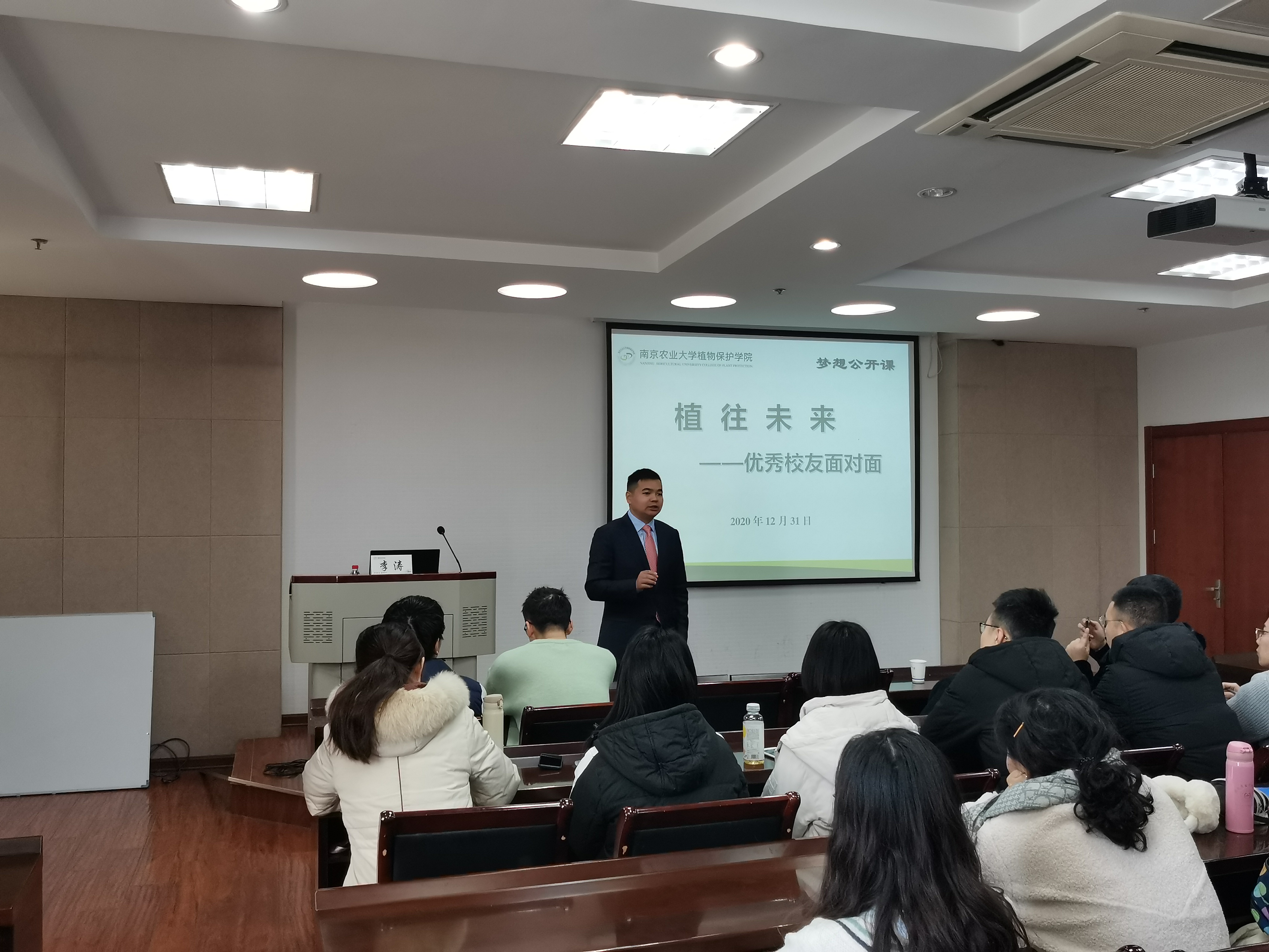 邀请优秀校友——杭州欢田喜地农业科技有限公司总经理李涛作《职业规划与选择》专题讲座。讲座由学院党委书记邵刚主持。