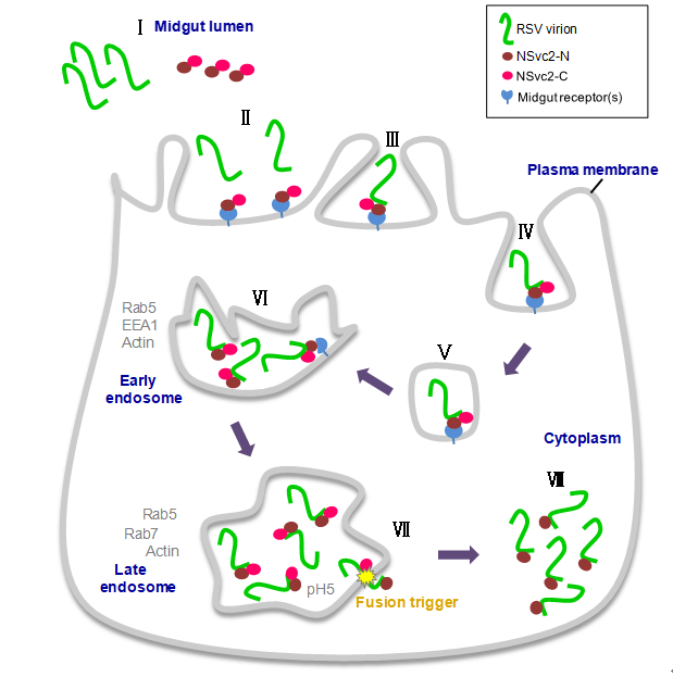 “虽然水稻条纹病毒粒子在电镜下是丝状无规则形态,但病毒基因组编码一种糖蛋白NSvc2,它并不在粒子表面,这类糖蛋白在球状囊膜结构的动植物病毒中负责昆虫介体特异性识别病毒的作用,那么NSvc2蛋白不在病毒粒体上为何又病毒编码这个蛋白呢?”带着这种疑问,植物病毒团队发现该蛋白在植物体内会被切割成两半,这两个“分身”为帮助病毒成功进入灰飞虱体内分别行使两种不同的功能。NSvc2中氮端“分身”蛋白利用其糖基化修饰直接结合在灰飞虱害虫的肠腔内,通过与病毒表面的外壳蛋白相互作用而募集病毒粒子;一旦被细胞表面受体识别,病毒被内吞逐级进入不同的内含体中,随后,另一个分身蛋白——NSvc2碳端蛋白经表面融合环结构与内含体内膜发生融合,帮助病毒释放到胞质中进行增殖传播。一旦将这两种分身蛋白的活性丧失,灰飞虱就无法获毒和传播该病毒。该研究首次发现循回增殖型病毒利用“辅助因子”突破昆虫介体中肠屏障并帮助自身远距离传播,这为病毒病害的防治提供了一种新的理论基础。