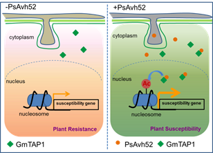 组蛋白乙酰化修饰是生物生长发育过程中参与调控基因表达的一种重要方式。本研究组此前发现大豆疫霉病菌侵染寄主中后期表达的效应子Avh23能够抑制组蛋白乙酰化酶复合体的形成,干扰组蛋白的乙酰化,抑制了抗病基因的表达 (Current Biology,2017)。本项研究中发现大豆疫霉侵染早期分泌的效应分子Avh52能够挟持大豆的组蛋白乙酰转移酶蛋白GmTAP1,使GmTAP1由细胞质进入细胞核,通过乙酰化植物感病基因启动子区组蛋白H2AH3上的激活位点,激活寄主感病基因的表达,促进了病原菌的成功侵染。以上研究表明病原菌能够在侵染寄主不同阶段能够利用不同效应子,通过精确调控表观遗传修饰水平,干扰植物免疫反应。