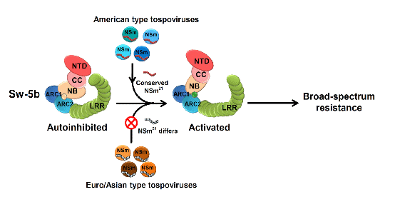 番茄斑萎病毒属(Tospovirus)病毒及其典型成员番茄斑萎病毒 (Tomato spotted wilt virus, TSWV) 可侵染1000多种植物,每年在全球范围内造成数十亿美元的经济损失,被列为全球为害最严重的植物病毒之一。在我国发生的番茄斑萎病毒属病毒包括美洲型和欧亚型两大类,其中流行最为广泛的TSWV则属于美洲型病毒。该研究发现来自番茄的免疫受体蛋白Sw-5b可通过识别美洲型番茄斑萎病毒编码的移动蛋白NSm中的一段高度保守的由21个氨基酸组成的肽段(NSm21)从而实现其对该类病毒的广谱抗性。进一步研究发现Sw-5b是通过与NSm21发生直接互作来诱导植物的防御反应的。该研究还鉴定了Sw-5b识别NSm21的关键位点,并进一步揭示了受体蛋白从识别到抗性激活的转换分子机制。另外,对南美野生番茄Sw-5的进化研究发现该免疫受体蛋白对病毒的识别位点是在长期的正向选择作用下进化而来的。