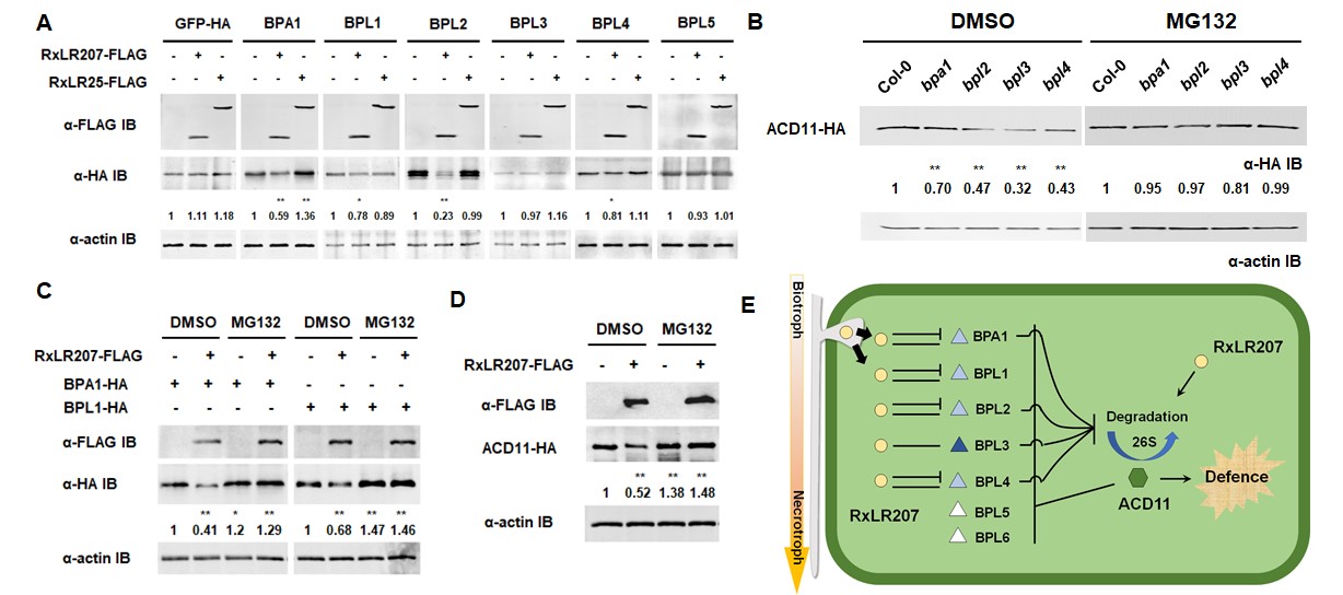 以往的研究表明,作物受疫霉菌感染后,就像人类的感冒发烧一样,会激发免疫反应,用自身的免疫力杀死病菌。南京农业大学作物疫病研究团队近年来对辣椒疫霉菌进行了系统地研究,精确定位到它的一个致病关键成员,即效应子RxLR207。研究人员以辣椒疫霉菌的一种寄主模式植物拟南芥为研究对象,通过靶标筛选,发现RxLR207直接作用于拟南芥中的一组未知功能蛋白,研究显示这组蛋白与一个植物免疫系统的重要调控因子ACD11 (accelerated cell death11)互作,故将其命名为BPA1 (binding partner of ACD11)BPLs (BPA1 Like proteins)