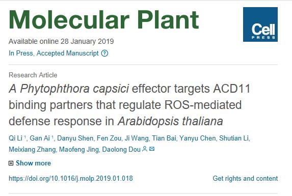 该研究结果以”A Phytophthoracapsici effector targetsACD11 binding partners that regulate ROS-mediated defense response in Arabidopsis thaliana为题近日在国际知名学术期刊《分子植物》(Molecular Plant)上发表。博士后李琦与博士生艾干为论文第一作者,窦道龙教授为通讯作者,景茂峰和张美祥两位副教授也参与工作。该研究得到了国家杰出青年科学基金和国家自然科学基金创新研究群体等项目的资助。