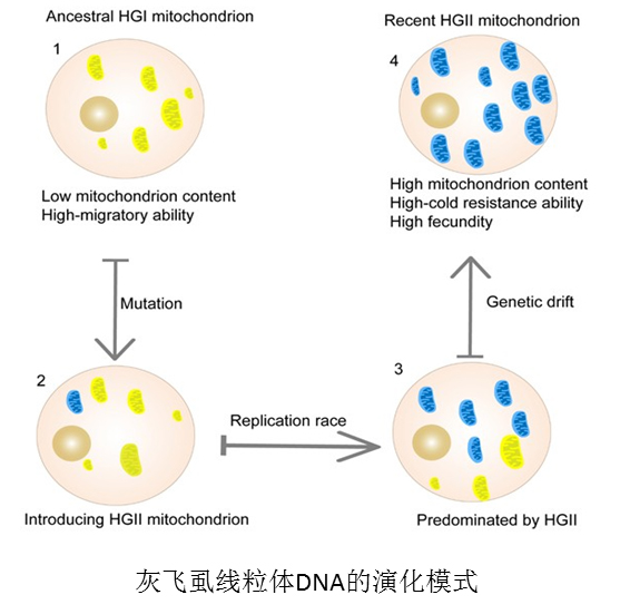 该项研究发现,灰飞虱自然种群中存在两类线粒体DNA(HGI,HGII),且HGII由HGI演化而来,在演化过程中ND2、ND5、CYTB基因的变异受到了低温环境的选择。具有HGII型线粒体的灰飞虱较具有HGI型的灰飞虱在线粒体DNA拷贝数、耐寒能力和产卵量上具有显著的优势,可能是其演化的动力。研究提出灰飞虱线粒体的DNA的适应性演化模型:灰飞虱线粒体DNA的变异导致了其DNA复制能力的提高,使其能够抵御遗传漂变作用而被保留下来;同时这些变异带来了生殖和耐寒力方面的优势,使其能够在种群中得到扩散。种群遗传分析还推测灰飞虱线粒体DNA由HGI型向HGII的演化可能导致了灰飞虱迁飞能力的降低,由迁飞型逐渐转变为居留型。