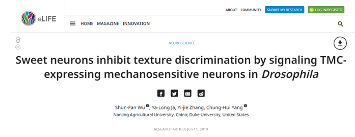 研究论文“Sweet neurons inhibit texture discrimination by signaling TMC-expressing mechanosensitive neurons in Drosophila”于2019年6月11日以长文形式出版在eLife杂志。吴顺凡博士是论文的第一作者和共同通讯作者,杜克大学Yang Chung-Hui博士是论文的共同通讯作者,植保院硕士生贾亚龙和博士生张伊杰也参与了部分工作,南京农业大学为论文第一研究单位。该研究得到国家留学基金委,国家自然科学基金(批准号:31772205和31830075)以及美国NIH基金(R01GM100027)的资助。